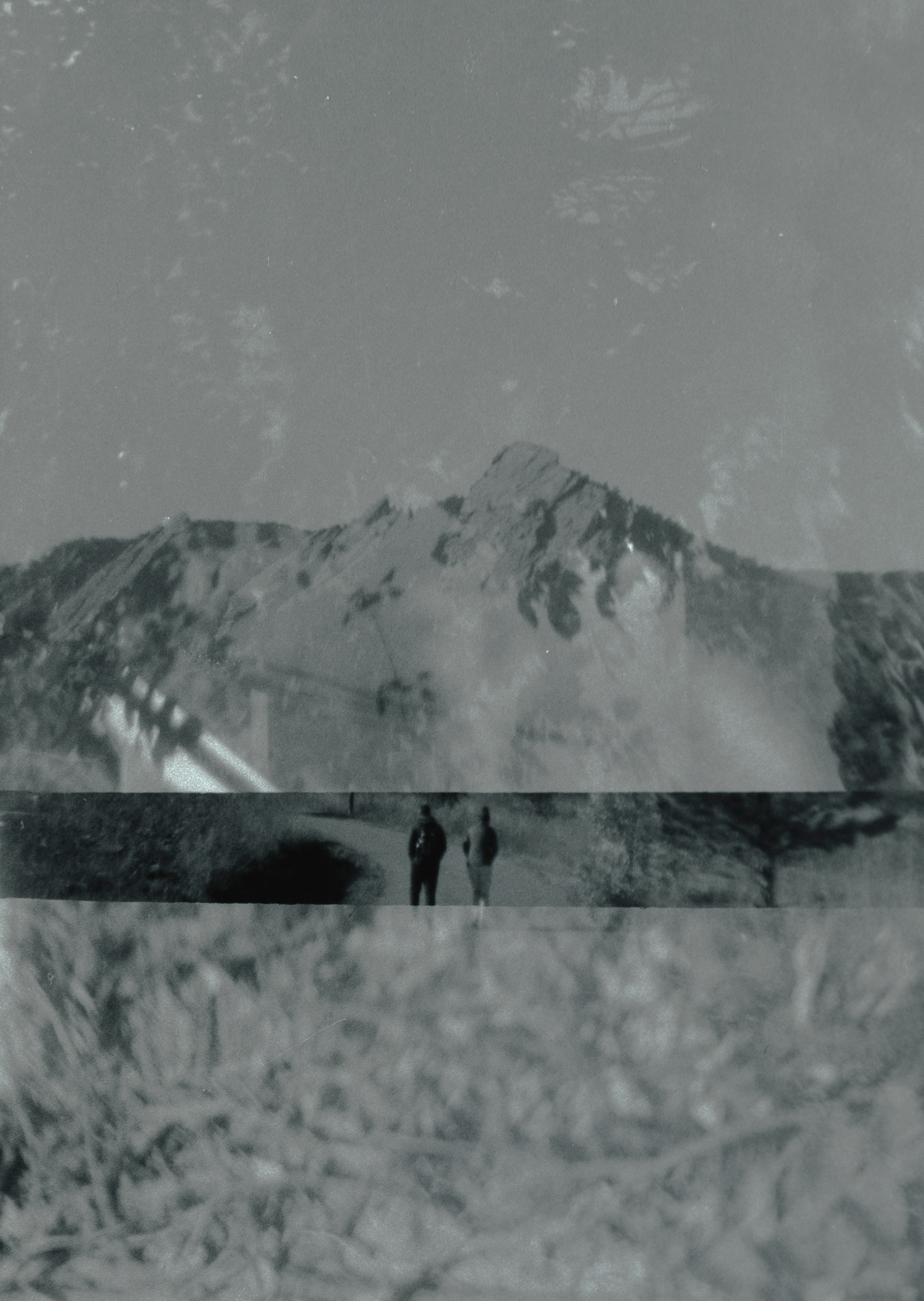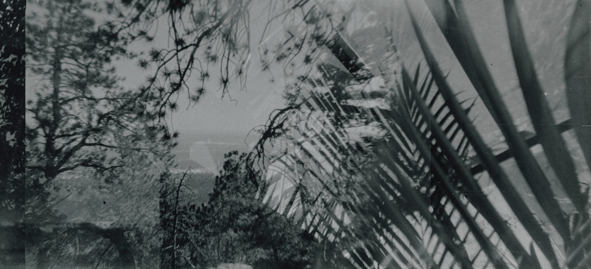 Fotografia analógica 35mm de dupla exposição utilizando uma câmera de brinquedo de 2 dólares com filme preto e branco não identificado.